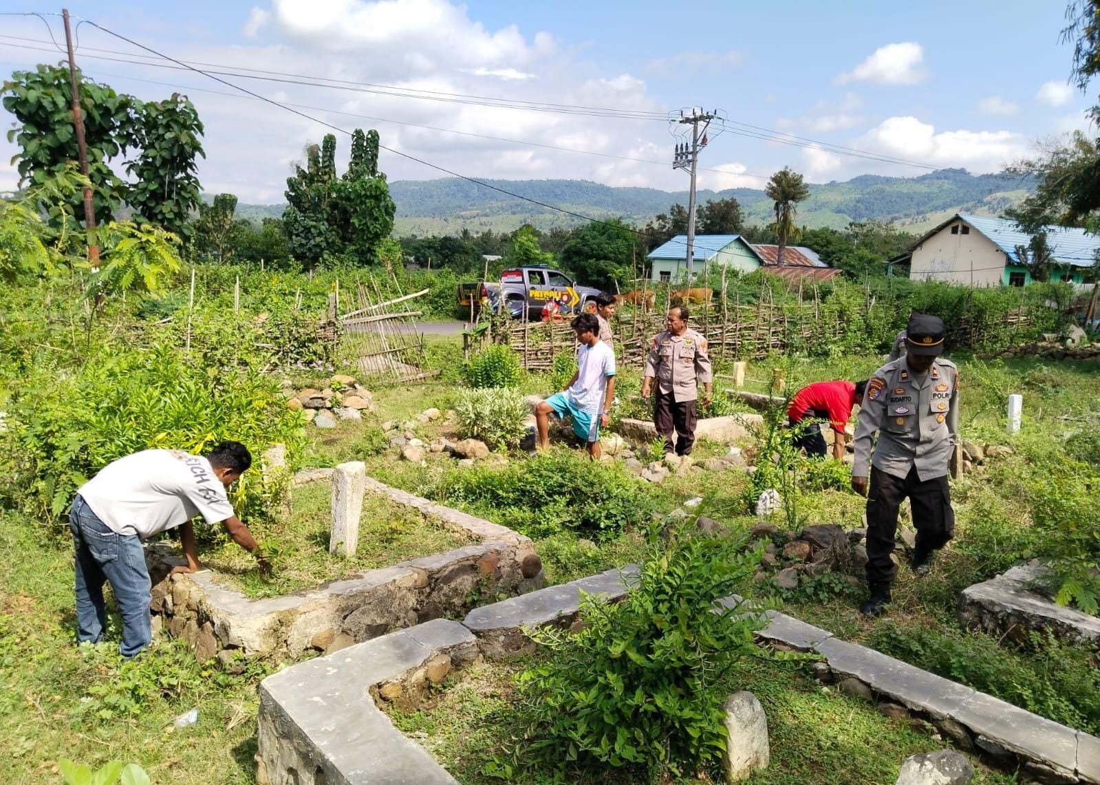 Bhakti Sosial Religi Jelang HUT Bhayangkara Ke-79 Polsek Monta Gotong Royong Bersama Bersihkan TPU