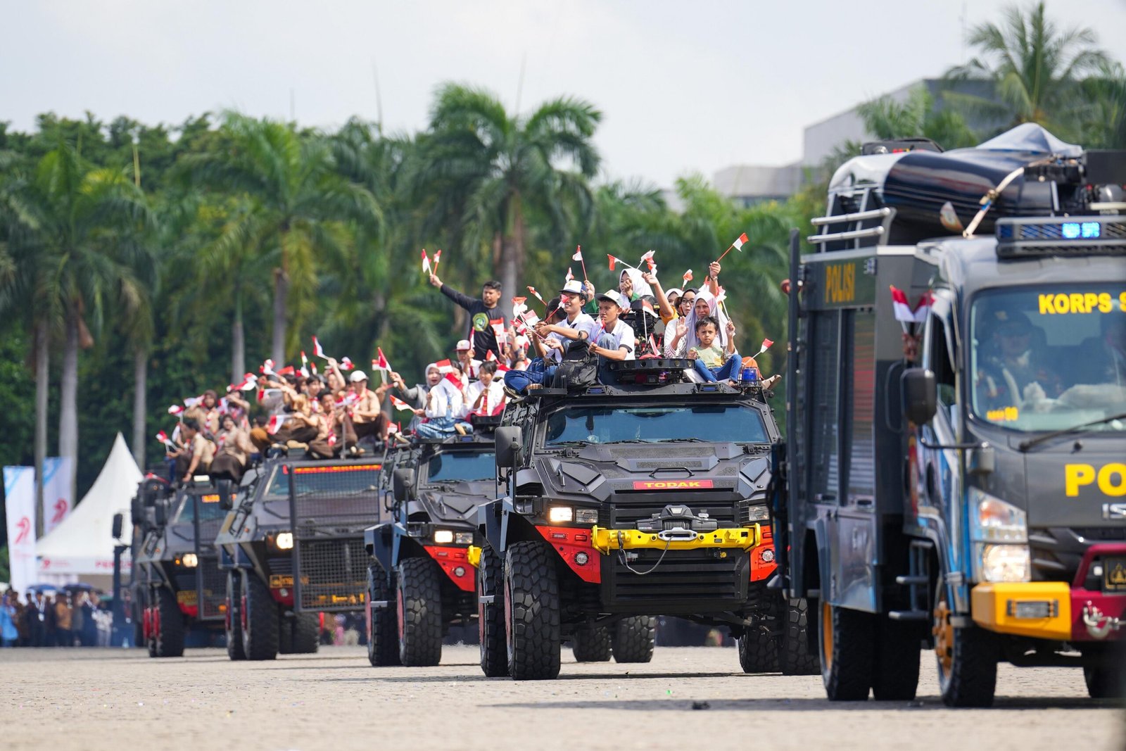 Selain itu, penerjun Polri juga ada yang membawa Bendera Sang Saka Merah Putih hingga Tri Brata Polri.
