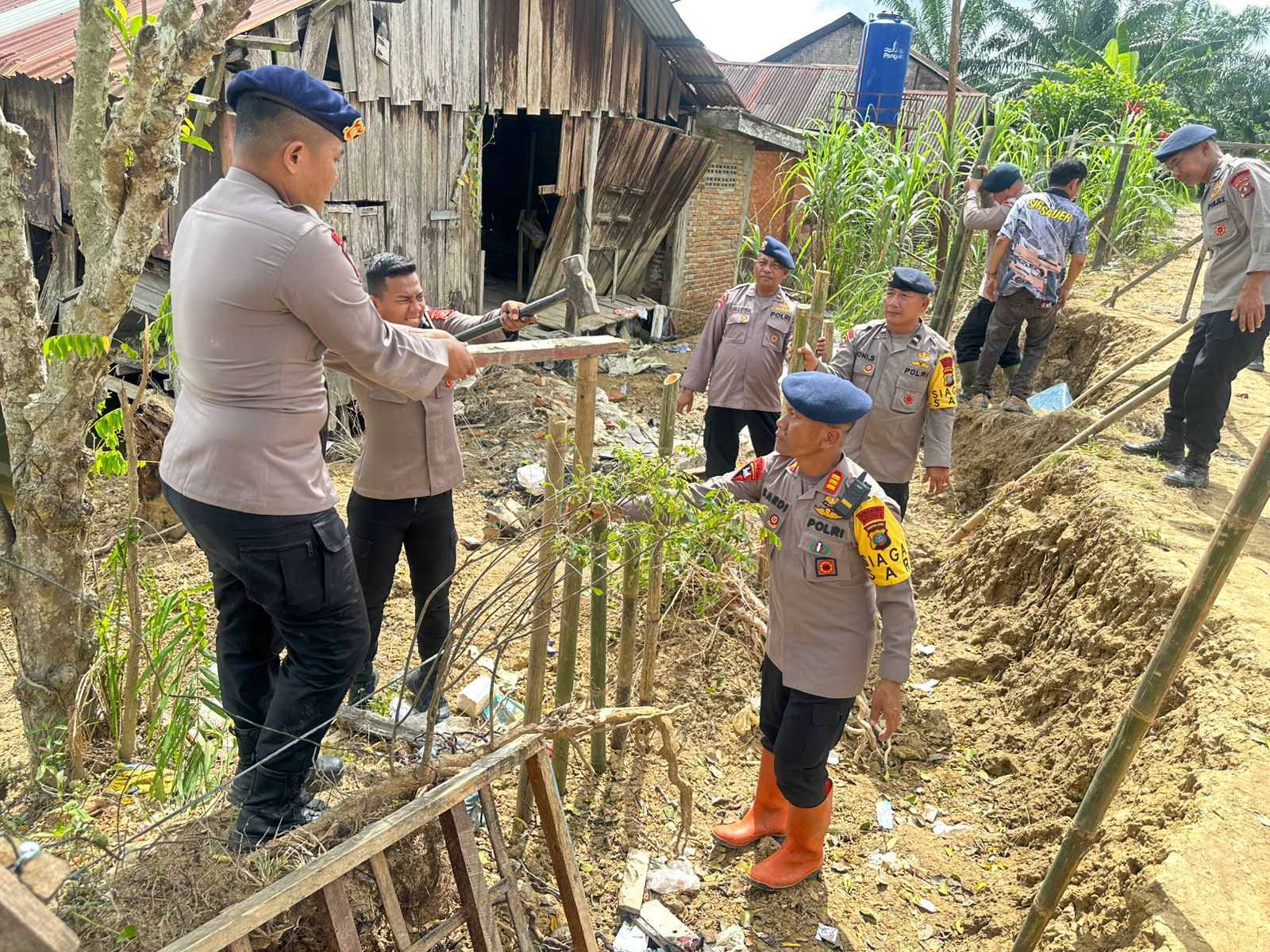 Proses perbaikan berlangsung kolaboratif; personel Brimob bergotong-royong bersama masyarakat, tokoh pemuda, dan perangkat desa. Warga yang tinggal di sekitar tanggul ikut mengangkat material timbun, menata cerocok bambu, dan memastikan jalur akses kembali bisa dilalui.